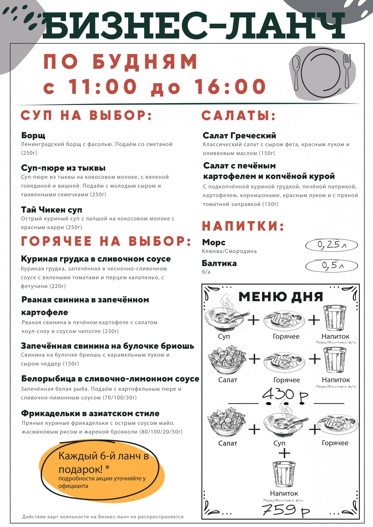 Ланч из трёх блюд и напитка = 759 рублей